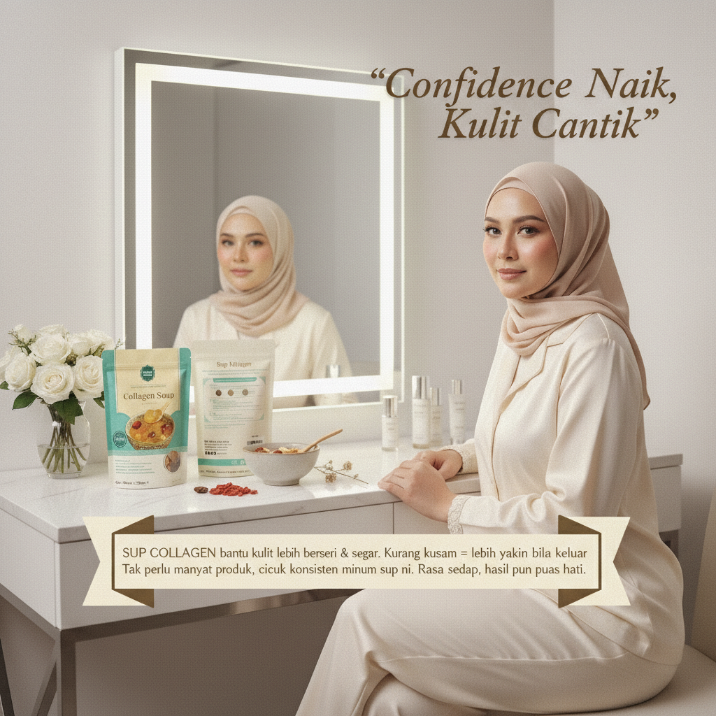 Wanita berusia sering alami kulit cepat kering. Sup collagen memberi hidrasi daripada nutrisi yang membantu kulit kekal lembap sepanjang hari.
